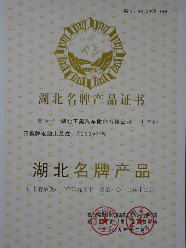 我公司生產(chǎn)的“正奧”牌電線束榮獲湖北省名牌產(chǎn)品稱號(hào)